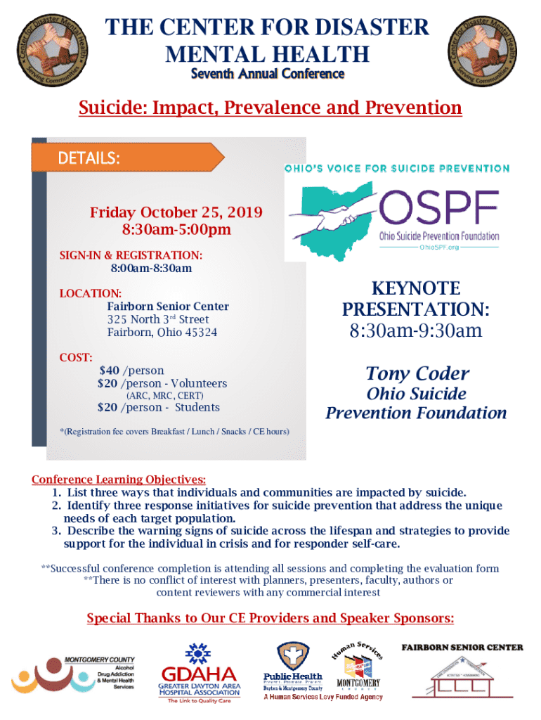 Join us on October 25, 2019, for a vital conference on suicide prevention, featuring expert keynote speakers and learning objectives to enhance community response.