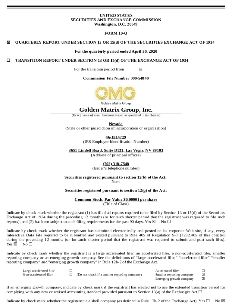 UNITED STATES SECURITIES AND EXCHANGE COMMISSION Washington, D.C. 20549 FORM 10Q QUARTERLY REPORT UNDER SECTION 13 OR 15(d) OF THE SECURITIES EXCHANGE ACT OF 1934 For the quarterly period ended April 30, 2020TRANSITION REPORT UNDER SECTION 13 OR 15(d) OF THE EXCHANGE ACT OF 1934 For the transition period from ___ to ___ Commission File Number 00054840Golden Matrix Group, Inc. (Exact name of small business issuer as specified in its charter)Nevada (State or other jurisdiction of