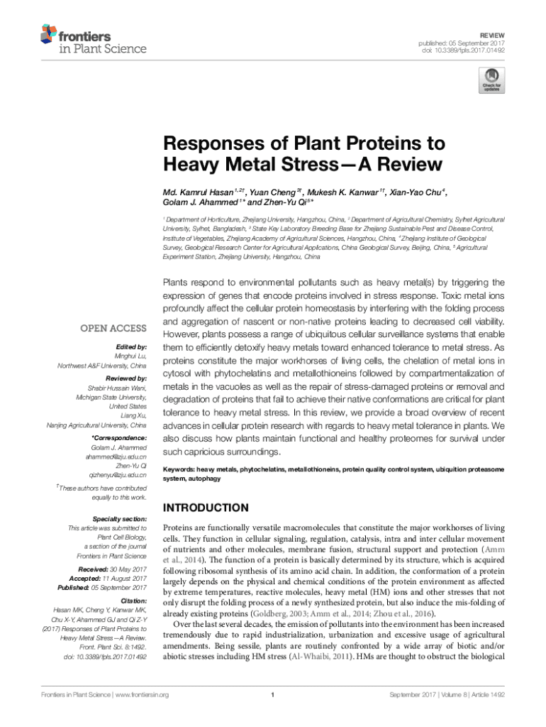 REVIEW published: 05 September 2017 DOI: 10.3389/fpls.2017.01492Responses of Plant Proteins to Heavy Metal Stress Review Md. Karl Haman 1, 2, Yuan Cheng 3, Mukesh K. Kan war 1, Xiangya Chu 4, Golan
