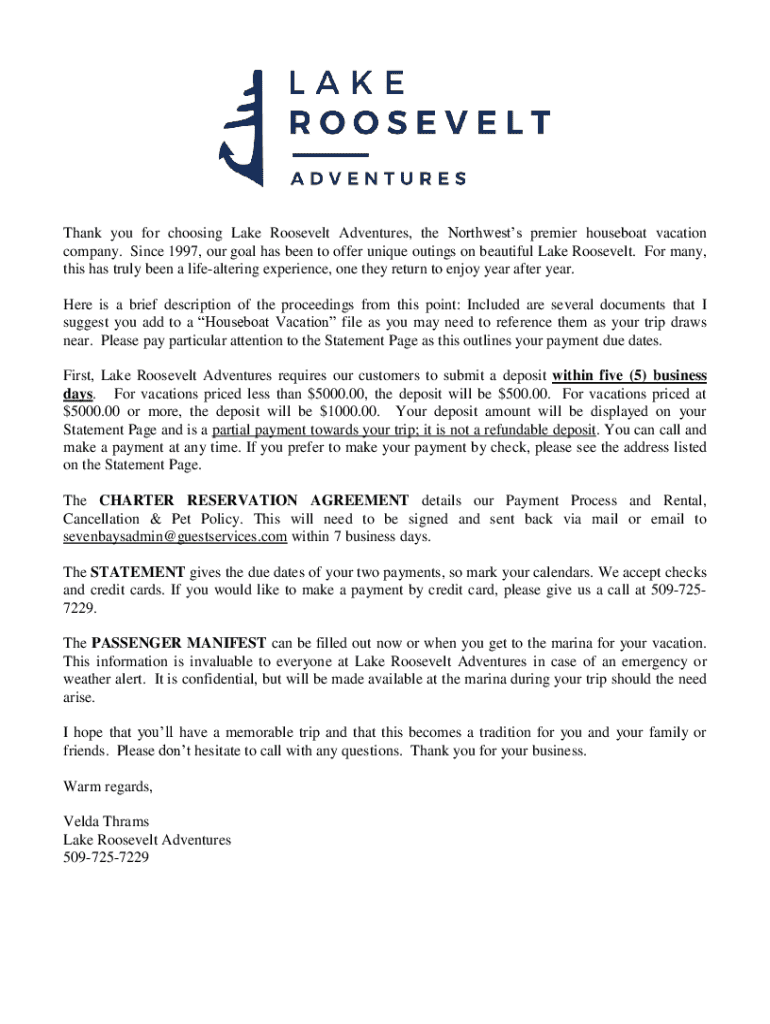Get the free Lake Roosevelt Adventures Houseboat Vacation Agreement