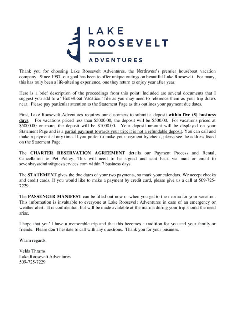 Thank you for choosing Lake Roosevelt Adventures, the Northwests premier houseboat vacation company. Since 1997, our goal has been to offer unique outings on beautiful Lake Roosevelt. For many, this