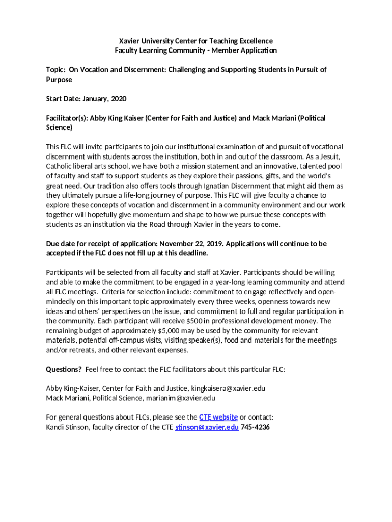 The Faculty Learning Community - Member Application is a fillable form in MS Word extension required to be submitted to the required address to provide some info. It must be completed and signed, which is possible in hard copy, or via a particular software such as PDFfiller. It helps to fill out any PDF or Word document directly in your browser, customize it according to your purposes and put a legally-binding e-signature. Once after completion, the user can send the Faculty Learning Community - Member Application to the appropriate individual, or multiple ones via email or fax. The blank is printable too thanks to PDFfiller feature and options proposed for printing out adjustment. Both in electronic and physical appearance, your form should have a organized and professional outlook. You may also turn it into a template for further use, there's no need to create a new file from the beginning. All that needed is to amend the ready template.