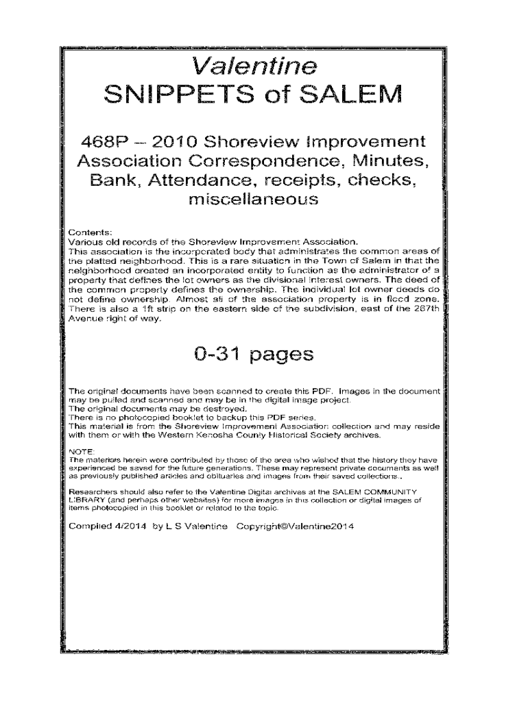 Valentine SNIPPETS of SALEM 468P 2010 Shoreview Improvement Association Correspondence, Minutes, Bank, Attendance, receipts, checks, miscellaneous Contents: Various old records of the Shoreview Improvement Association. This association is the incorporated body that administrates the common areas of the platted neighborhood. This is a rare situation in the Town of Salem in that the neighborhood created an incorporated entity to function as the administrator of a property that defines the lot...