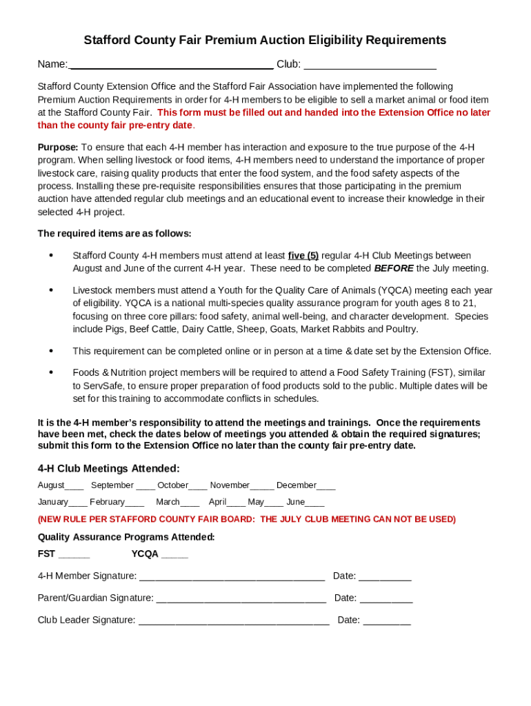 Instructions for the Stafford County Fair Premium Auction Eligibility Requirements form