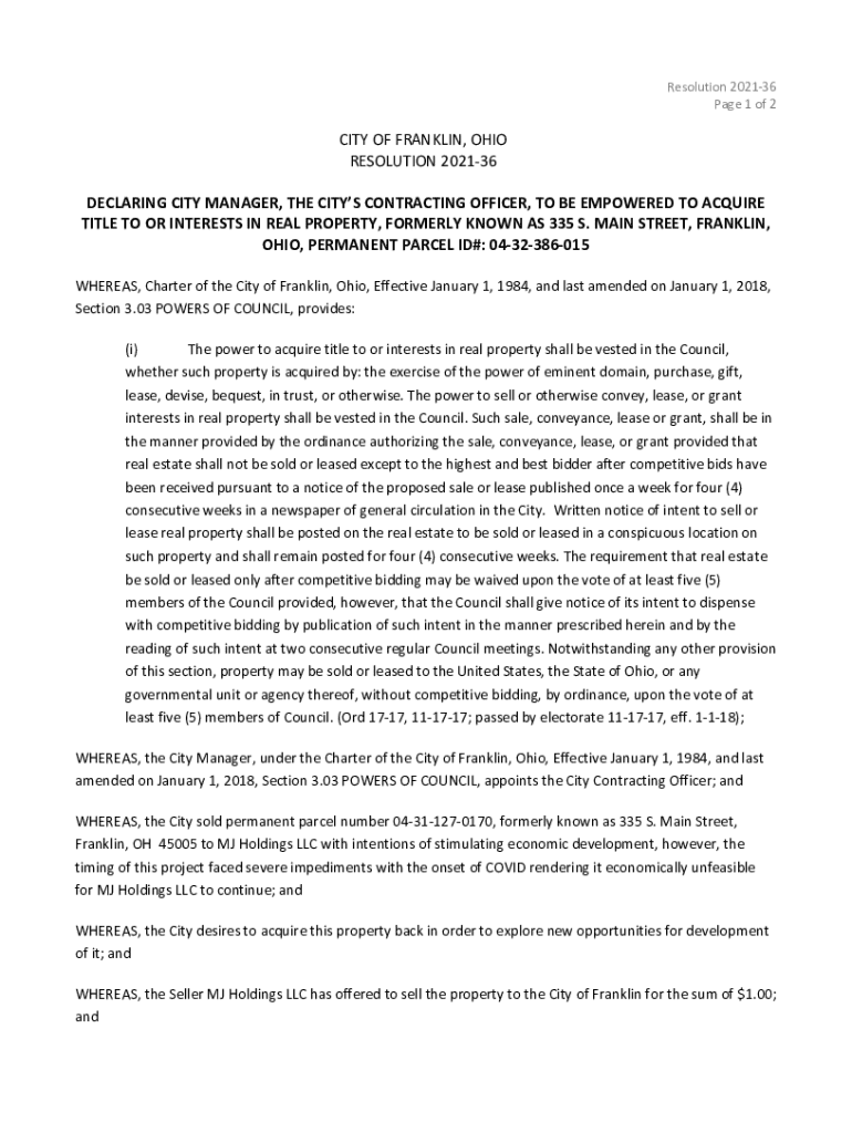 This document resolves the City of Franklin to acquire 335 S. Main Street for $1.00, enhancing local development and addressing public health and safety concerns.