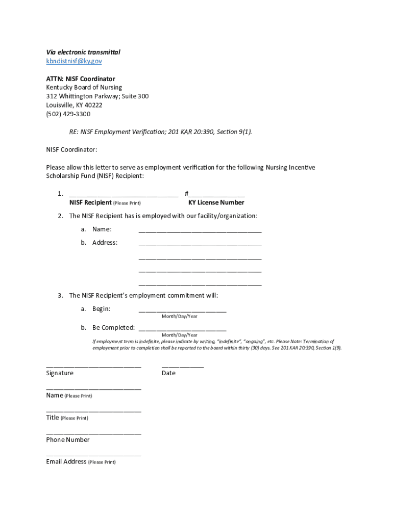 Via electronic transmittal kbndistnisf@ky.gov ATTN: NISF Coordinator Kentucky Board of Nursing 312 Whington Parkway; Suite 300 Louisville, KY 40222 (502) 4293300 RE: NISF Employment Verication; 201
