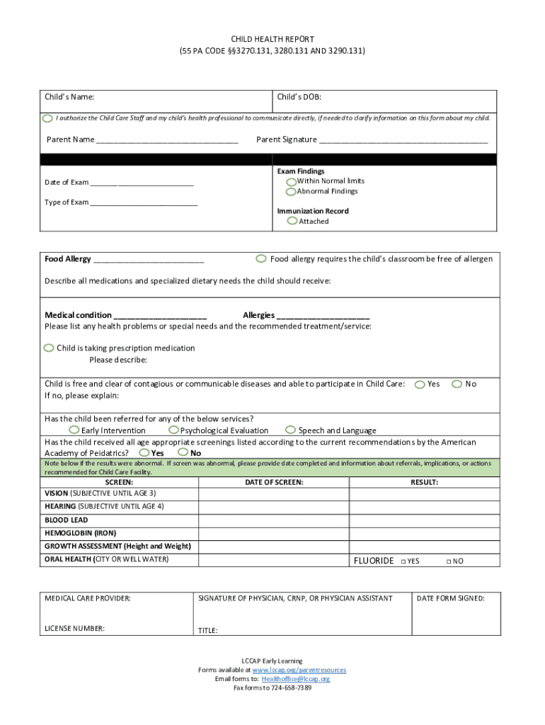A child health report is a document that provides an overview of a child's health status, including medical history, vaccinations, screenings, and other relevant health information.