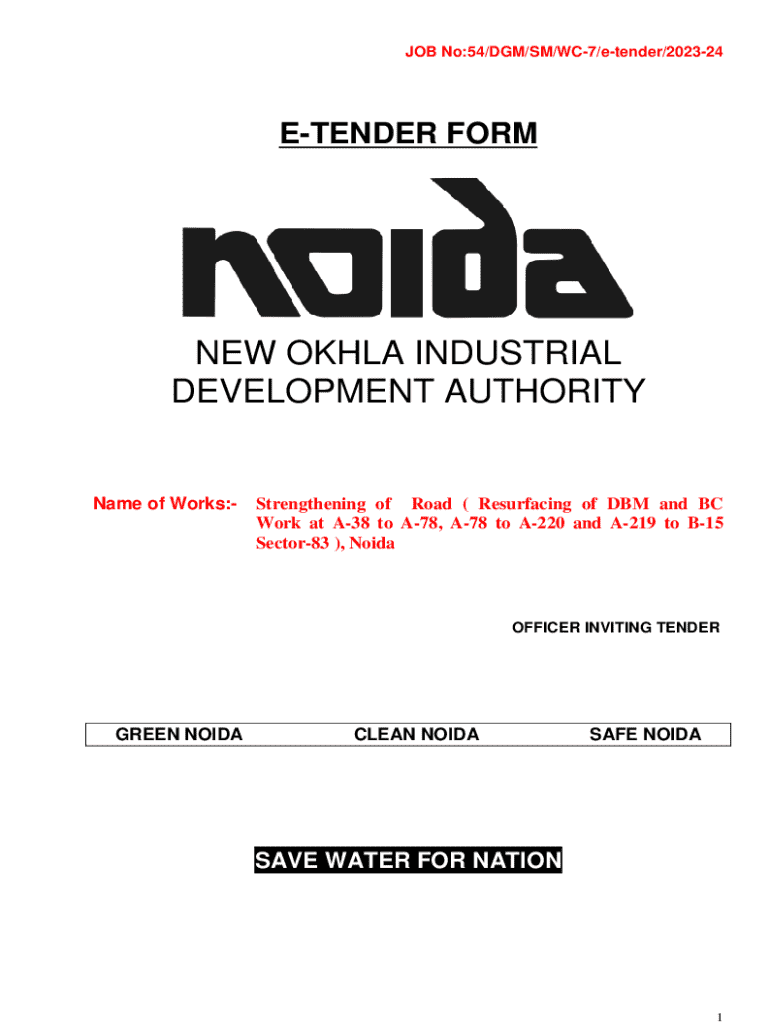JOB No:54/DGM/SM/WC7/etender/202324ETENDER FORMNEW OKHLA INDUSTRIAL DEVELOPMENT AUTHORITYName of Works:Strengthening of Road ( Resurfacing of DBM and BC Work at A38 to A78, A78 to A220 and A219 to B15 Sector83 ), NoidaOFFICER INVITING TENDERGREEN NOIDACLEAN NOIDASAFE NOIDASAVE WATER FOR NATION1New Okhla Industrial Development Authority WORK CIRCLE7, SECTOR20, NOIDAETender Document for Name of Work:Strengthening of Road ( Resurfacing of DBM and BC Work at