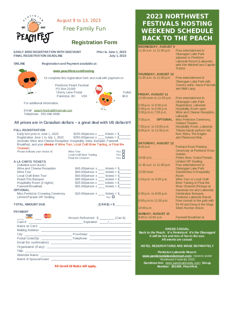 Once you are about to start completing the Penticton Peach Festival Registration writable form, it's important to make clear that all the required data is well prepared. This very part is important, so far as mistakes may result in unpleasant consequences. It is always irritating and time-consuming to re-submit an entire word form, not to mention penalties resulted from blown deadlines. To work with your digits requires more concentration. At first glimpse, there is nothing tricky with this task. Nonetheless, there's nothing to make a typo. Experts suggest to record all data and get it separately in a different document. When you have a sample, you can just export it from the file. Anyway, you ought to pay enough attention to provide true and correct info. Check the information in your Penticton Peach Festival Registration form carefully while filling all necessary fields. In case of any mistake, it can be promptly fixed within PDFfiller editing tool, so that all deadlines are met.