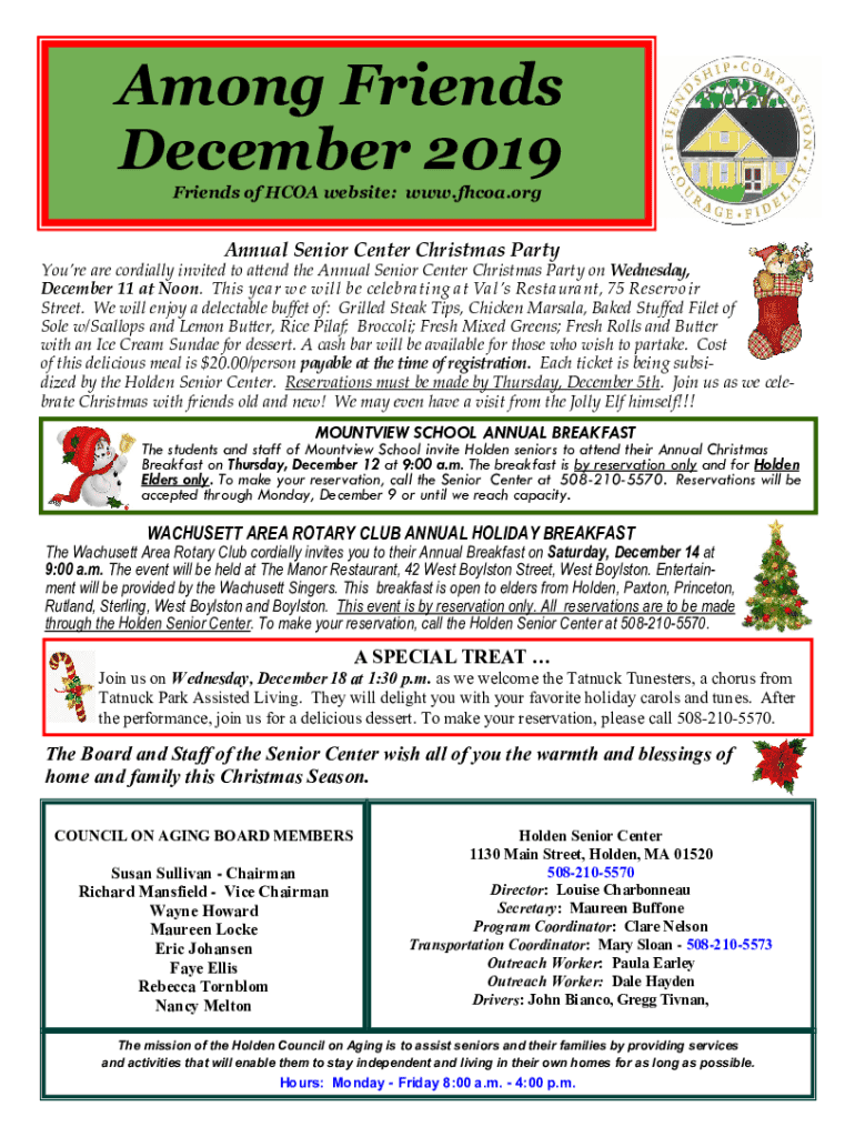 Join us for the Annual Senior Center Christmas Party and various holiday events in December 2019. Celebrate with delicious meals and activities!