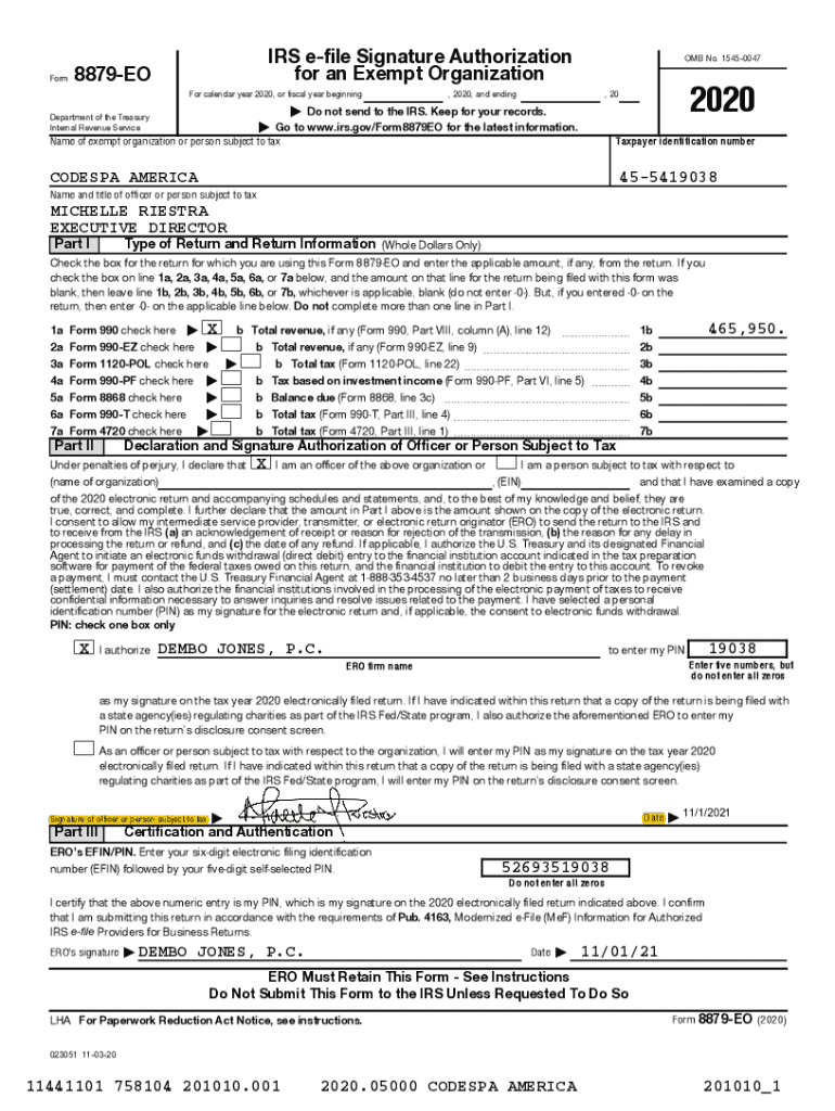 FormIRS efile Signature Authorization for an Exempt Organization8879EOFor calendar year 2020, or fiscal year beginningOMB No. 15450047, 2020, and ending2020, 20| Do not send to the IRS. Keep for your records. | Go to www.irs.gov/Form8879EO for the latest information. Name of exempt organization or person subject to taxDepartment of the Treasury Internal Revenue ServiceTaxpayer identification numberCODESPA AMERICA455419038Name and title of officer or person subject to