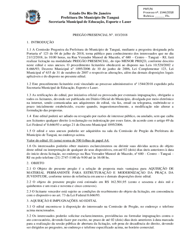 Estado Do Rio De Janeiro Prefeitura Do Municpio De Tangu Secretaria Municipal de Educao, Esporte e LaserPMT/RJ Processo n. 1544/2018 Rubrica: ___ Fls.PREGO PRESENCIAL N. 103/2018 1. INTRODUO 1.1 A