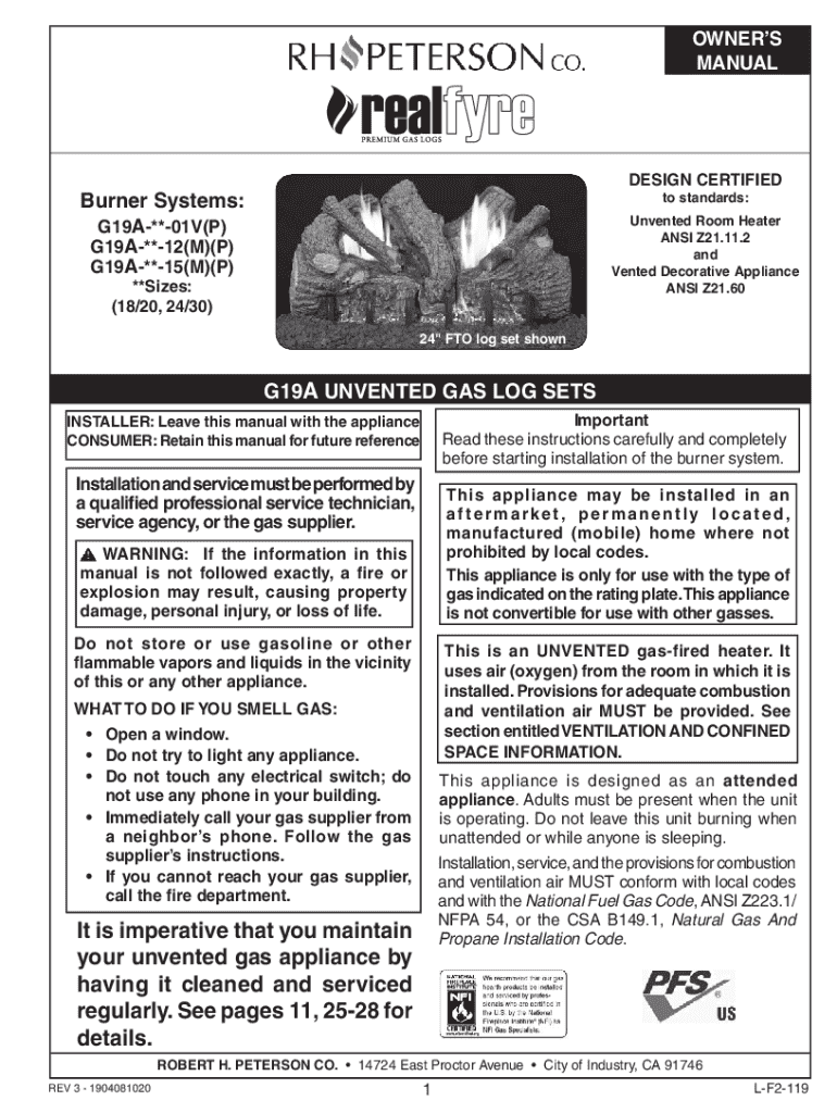 OWNERS MANUALDESIGN CERTIFIEDBurner Systems:to standards:G19A**01V(P) G19A**12(M)(P) G19A**15(M)(P)Unvented Room Heater ANSI Z21.11.2 and Vented Decorative Appliance ANSI Z21.60**Sizes: (18/20, 24/30) 24\" FTO log set shownG19A UNVENTED GAS LOG SETS Important Read these instructions carefully and completely before starting installation of the burner system.INSTALLER: Leave this manual with the appliance CONSUMER: Retain this manual for future referenceInstallation and service