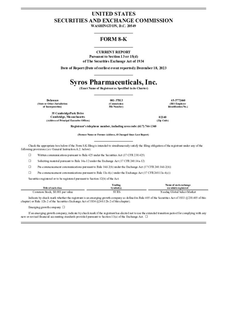 Syros Pharmaceuticals, Inc. reports on its December 18, 2023 underwriting agreement for the sale of shares and pre-funded warrants, addressing proceeds and SEC compliance.
