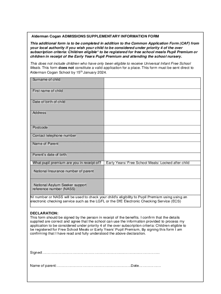Complete the Alderman Logan Admissions Supplementary Form for 2024 to register your child for eligible Free School Meals or Pupil Premium support.