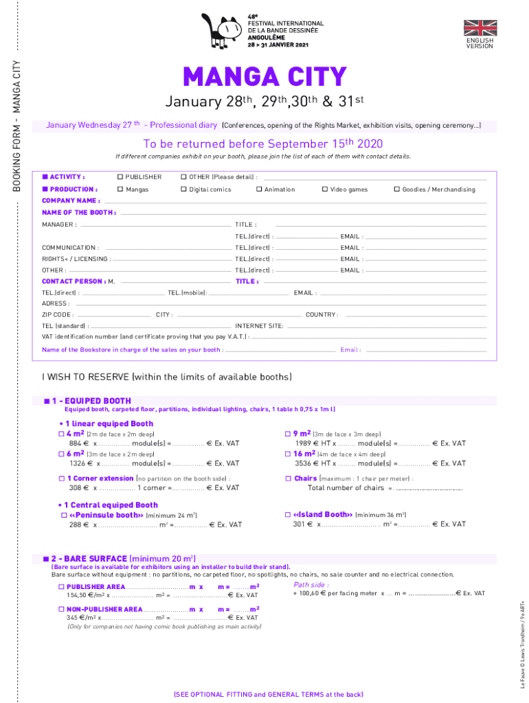 Complete the Manga City 2020 booking form to register as an exhibitor. Ensure details are filled accurately for booth allocation and payment.