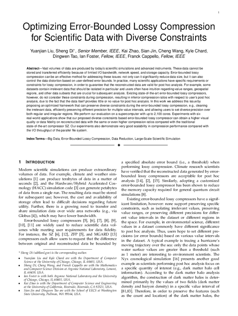 1Optimizing ErrorBounded Lossy Compression for Scientific Data with Diverse Constraints Yuanjian Liu, Sheng Di , Senior Member, IEEE, Kai Zhao, Sian Jin, Cheng Wang, Kyle Chard, Dingwen Tao, Ian Foster, Fellow, IEEE, Franck Cappello, Fellow, IEEE AbstractVast volumes of data are produced by todays scientific simulations and advanced instruments. These data cannot be stored and transferred efficiently because of limited I/O bandwidth, network speed, and storage capacity. Errorbounded