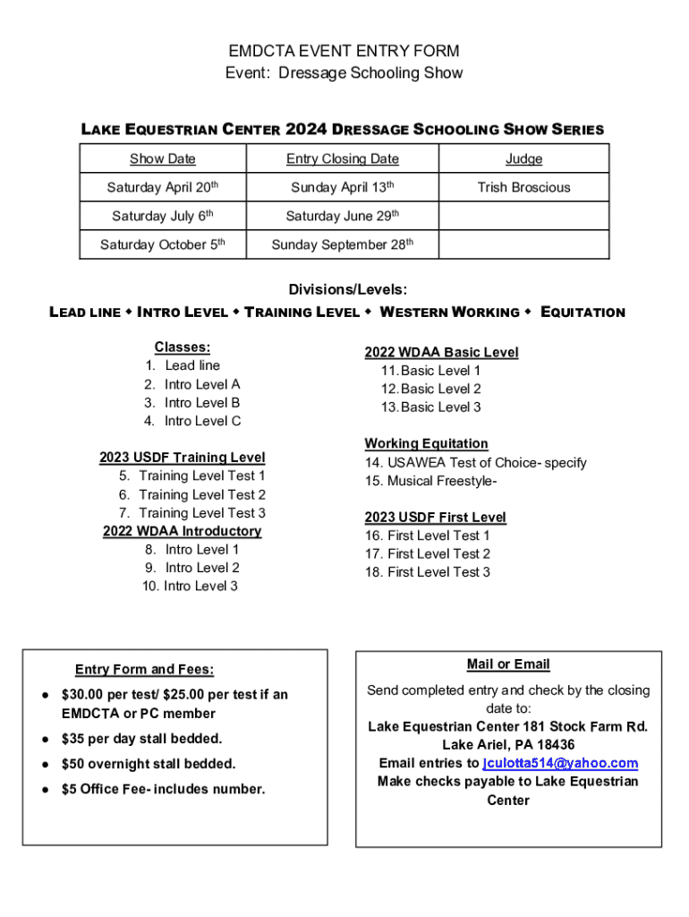 Register for the 2024 Dressage Schooling Show at Lake Equestrian Center. Submit your entry form and fees by the closing date to participate.