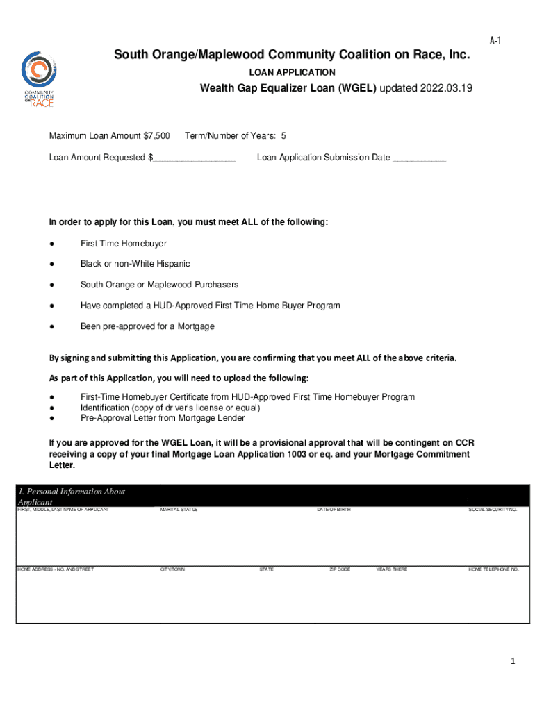 LOAN APPLICATIONWealth Gap Equalizer Loan (GEL) updated 2022.03.19Maximum Loan Amount $7,500Term/Number of Years: 5Loan Amount Requested