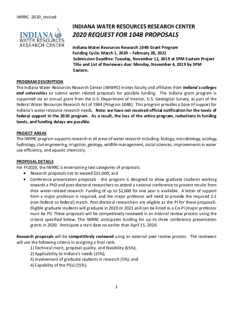 IWRRC 2020_revisedINDIANA WATER RESOURCES RESEARCH CENTER2020 REQUEST FOR 104B PROPOSALSIndiana Water Resources Research 104B Grant Program Funding Cycle: March 1, 2020 February 28, 2021 Submission
