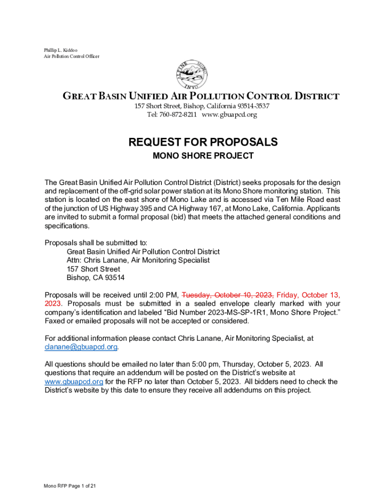 The Great Basin Unified Air Pollution Control District invites proposals for designing and replacing the off-grid solar power station at Mono Shore to enhance monitoring capabilities.