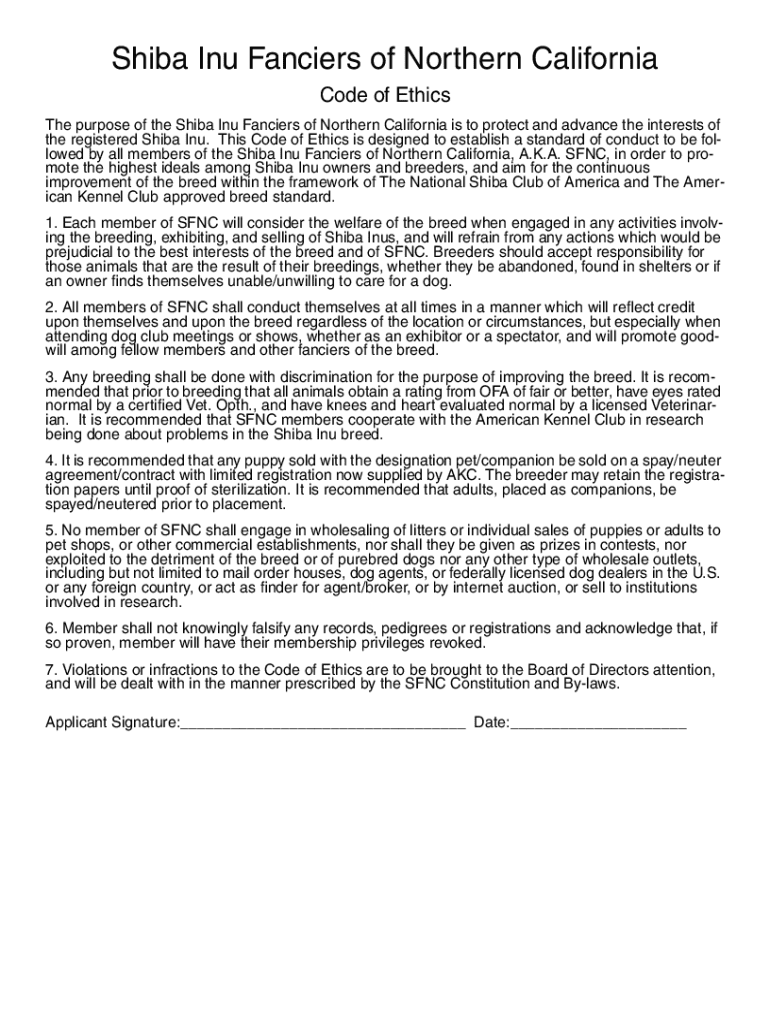 Get the free Shiba Inu Fanciers of Northern California Code of Ethics