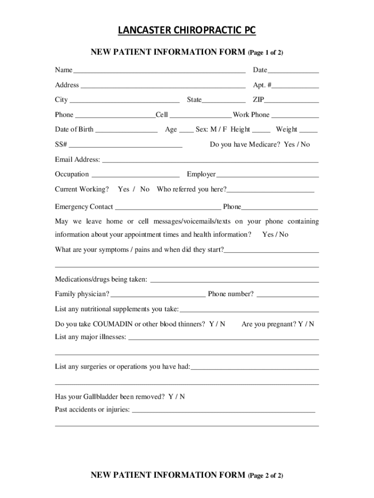 LANCASTER CHIROPRACTIC PC NEW PATIENT INFORMATION FORM (Page 1 of 2) Name ___Date ___Address ___Apt. #___City ___ZIP___State___Phone ___Cell ___ Work Phone ___ Date of Birth ___Age ___ Sex: M / F