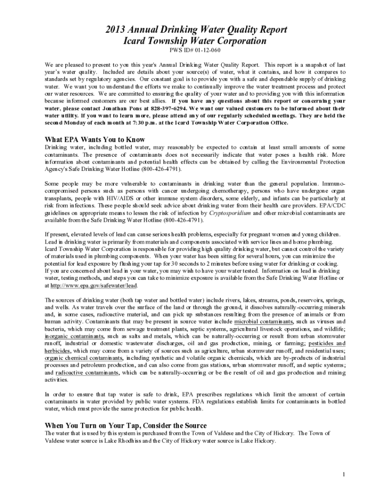 Explore Icard Township\'s 2013 Annual Drinking Water Quality Report detailing water quality, sources, contaminants, and safety measures. Stay informed for better health.
