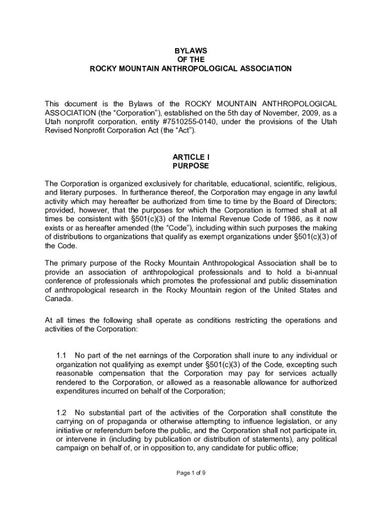 Explore the bylaws of the Rocky Mountain Anthropological Association, established in 2009, detailing its purpose, structure, and governance.
