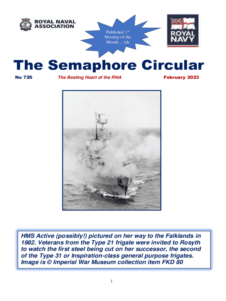 Published 1st Monday of the Month ishThe Semaphore Circular No 726The Beating Heart of the RNAFebruary 2023HMS Active (possibly!) pictured on her way to the Falklands in 1982. Veterans from the Type