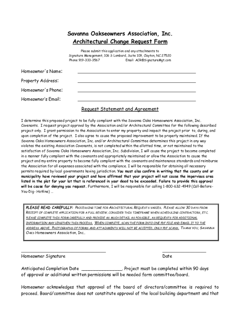 Submit your architectural change request to the Savanna Oaks Homeowners Association for project approval, ensuring compliance with association covenants.