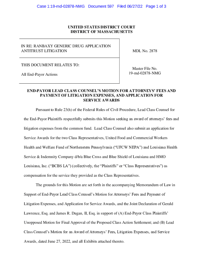 Case 1:19md02878NMG Document 597 Filed 06/27/22 Page 1 of 3UNITED STATES DISTRICT COURT DISTRICT OF MASSACHUSETTSIN RE: RANBAXY GENERIC DRUG APPLICATION ANTITRUST LITIGATIONTHIS DOCUMENT RELATES TO: All EndPayor ActionsMDL No. 2878Master File No. 19md02878NMGENDPAYOR LEAD CLASS COUNSELS MOTION FOR ATTORNEYS FEES AND PAYMENT OF LITIGATION EXPENSES, AND APPLICATION FOR SERVICE AWARDS Pursuant to Rule 23(h) of the Federal Rules of Civil Procedure, Lead Class Counsel for the