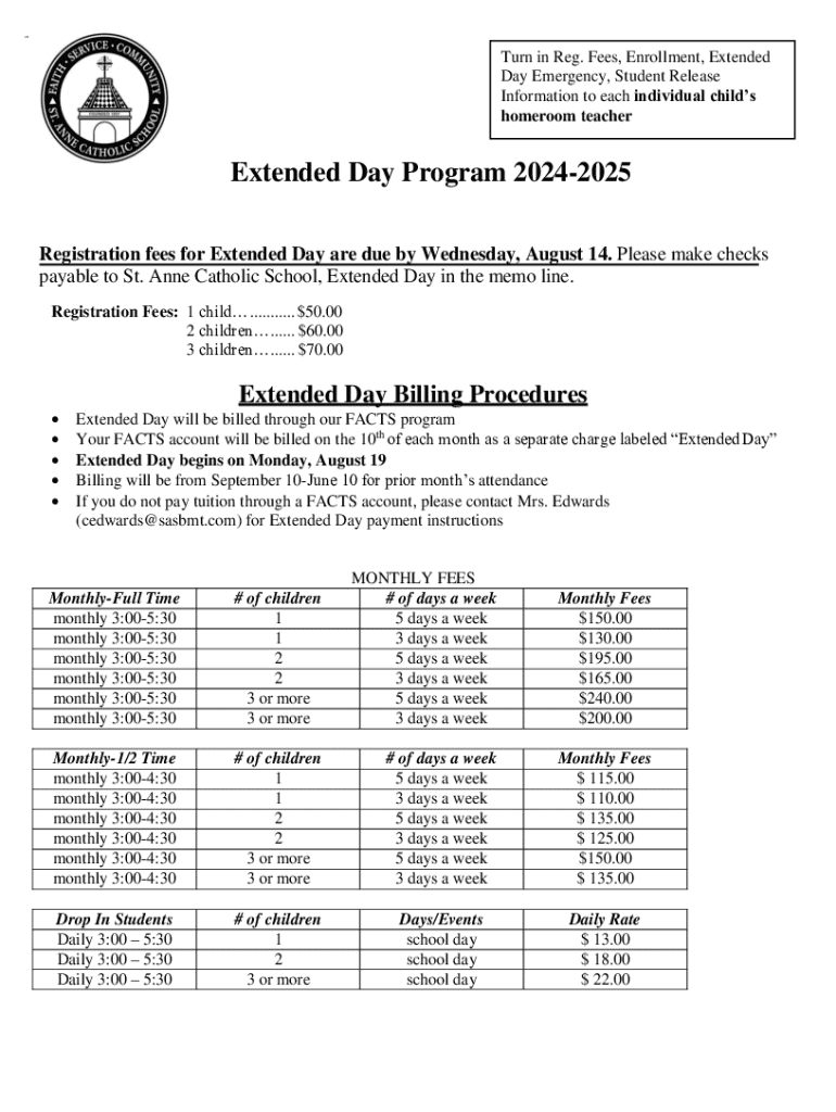 Enroll your child in the St. Anne Extended Day Program for 2024-2025. Include emergency contact information and ensure your child\'s safety.