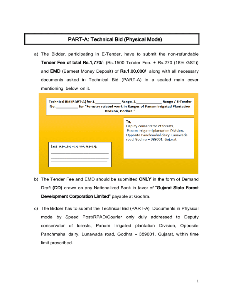 Detailed instructions for submitting a Technical Bid for Gujarat State Forest Development Corporation\'s E-Tender. Includes fee structure and required documents.