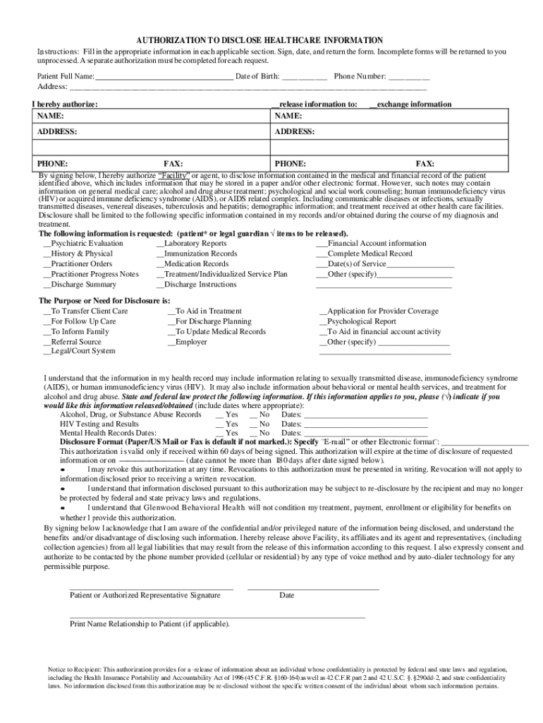 AUTHORIZATION TO DISCLOSE HEALTHCARE INFORMATION Instructions: Fill in the appropriate information in each applicable section. Sign, date, and return the form. Incomplete forms will be returned to