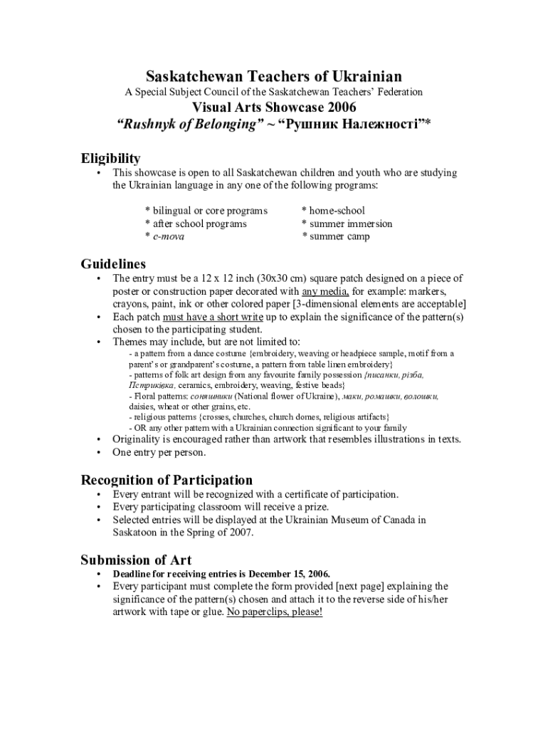 Participate in the 2006 Visual Arts Showcase for Saskatchewan youth studying Ukrainian. Showcase your art reflecting Ukrainian heritage by December 15, 2006.
