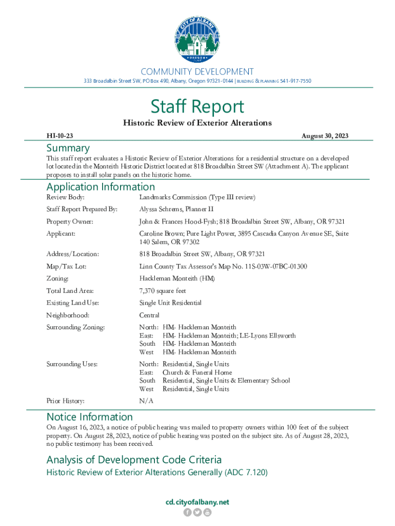 This staff report evaluates the Historic Review of Exterior Alterations for the installation of solar panels on a historic home located at 818 Broadalbin Street SW, Albany, OR.