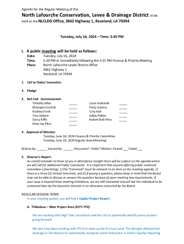 held at the LCD Office, 3862 Highway 1, Graceland, LA 70394Tuesday, July 16, 2024, Time: 5:30 PMI.