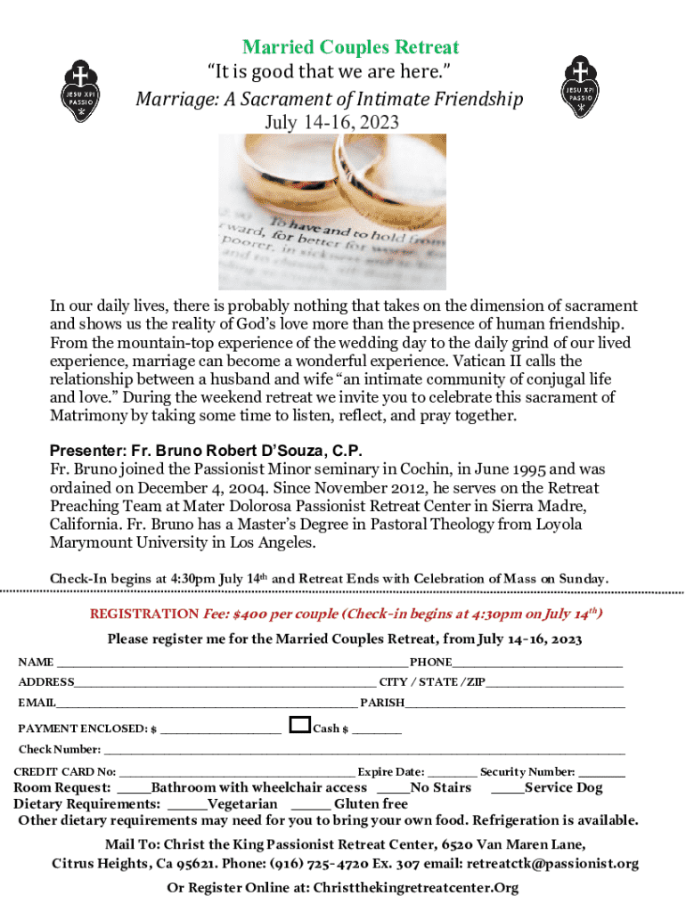 Married Couples Retreat It is good that we are here. Marriage: A Sacrament of Intimate Friendship July 1416, 2023In our daily lives, there is probably nothing that takes on the dimension of sacrament