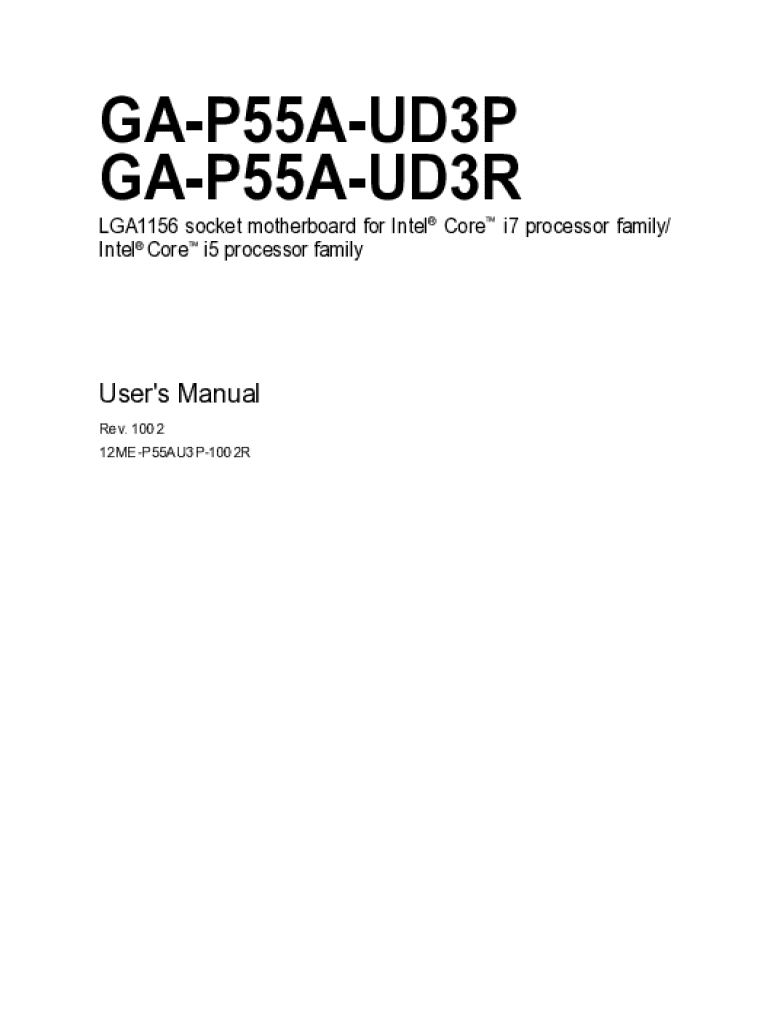 GAP55AUD3P GAP55AUD3RLGA1156 socket motherboard for Intel Core i7 processor family/ Intel Core i5 processor familyUser\'s Manual Rev. 1002 12MEP55AU3P1002RMotherboard GAP55AUD3P/GAP55AUD3ROct. 16, 2009Motherboard GAP55AUD3P/ GAP55AUD3ROct. 16, 2009Copyright 2009 GIGABYTE TECHNOLOGY CO., LTD. All rights reserved. The trademarks mentioned in this manual are legally registered to their respective owners.Disclaimer Information in this manual is protected by copyright laws and is the property of...