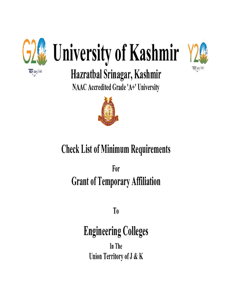University of Kashmir Hazra Hazratbal Srinagar, Kashmir NAAC Accredited Grade \'A+\' UniversityCheck List of Minimum Requirements ForGrant of Temporary Affiliation ToEngineering Colleges In TheUnion