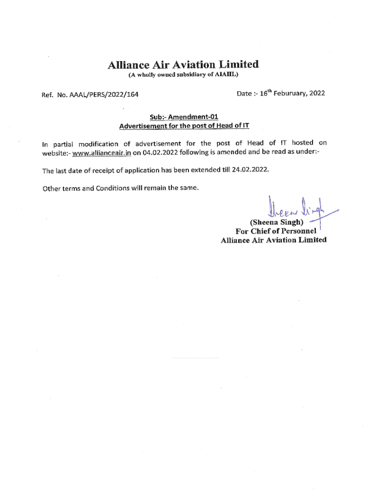 ALLIANCE AIR AVIATION LIMITED (A wholly owned subsidiary of AIHL)Sub: Advertisement three. No: BAAL/PEERS/2022/133Dated: 04 February, February 2022Subject: Advertisement for Head of IT HEAD IT Number