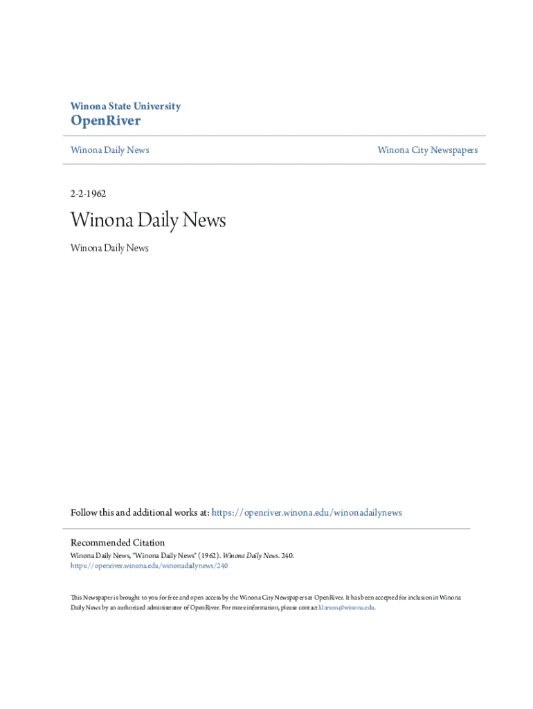 Winona State UniversityOpenRiver Winona Daily NewsWinona City Newspapers221962Winona Daily News Winona Daily NewsFollow this and additional works at: https://openriver.winona.edu/winonadailynews Recommended Citation Winona Daily News, \"Winona Daily News\" (1962). Winona Daily News. 240. https://openriver.winona.edu/winonadailynews/240This Newspaper is brought to you for free and open access by the Winona City Newspapers at OpenRiver. It has been accepted for inclusion in Winona Daily News by...