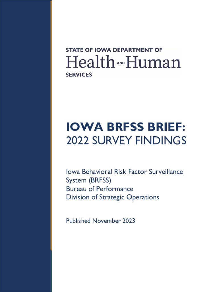 IOWA BRFSS BRIEF: 2022 SURVEY FINDINGS Iowa Behavioral Risk Factor Surveillance System (BRFSS) Bureau of Performance Division of Strategic Operations Published November 2023Citation & Acknowledgements Permission is granted for the use and reproduction of this publication provided that all reproductions contain appropriate reference to the source through the inclusion of the following citation: Iowa Department of Health and Human Services, Division of Strategic Operations, Bureau of Performance