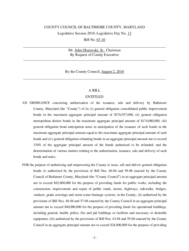 COUNTY COUNCIL OF BALTIMORE COUNTY, MARYLAND Legislative Session 2010, Legislative Day No. 13 Bill No. 6710 ___ Mr. John Olszewski, Sr., Chairman By Request of County Executive ___ By the County Council,