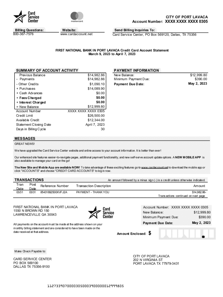 CITY OF PORT LAVACA Account Number: XXXX XXXX XXXX 0305 Billing Questions: 8003677576Webs ite: www.cardaccount.netSend Billing Inquiries To: Card Service Center, PO Box 569120, Dallas, TX 75356FIRST