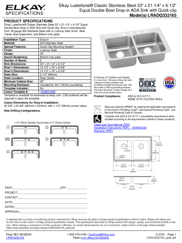 pdfFiller has made it simple to fill out and eSign elkay lradq3321 lustertone double. The application has capabilities that allow you to modify and rearrange PDF content, add fillable fields, and eSign the document. Begin a free trial to discover all of the features of pdfFiller, the best document editing solution.