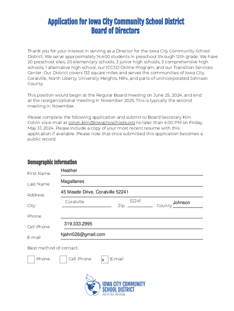 Application for Iowa City Community School District Board of Directors Thank you for your interest in serving as a Director for the Iowa City Community School District. We serve approximately 14,400