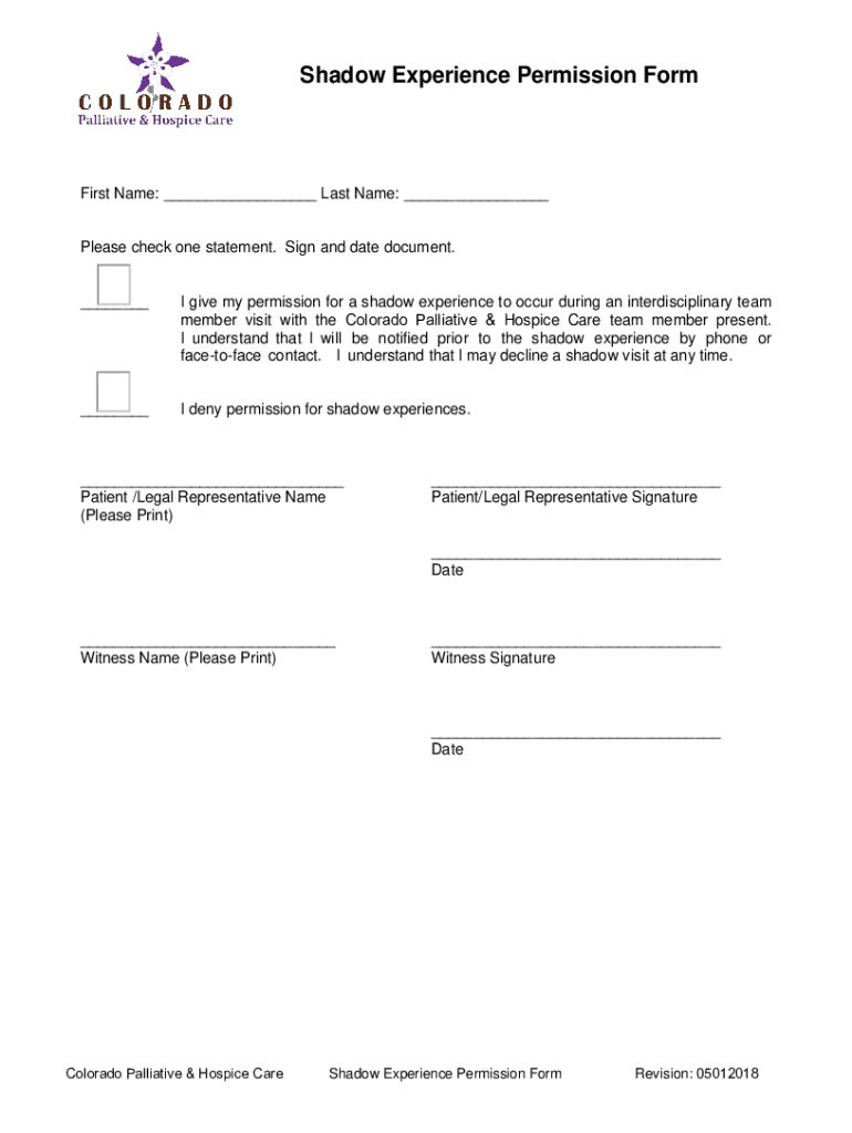 Grant permission for a shadow experience with the Colorado Palliative & Hospice Care team, or deny it. Complete the form with necessary details.