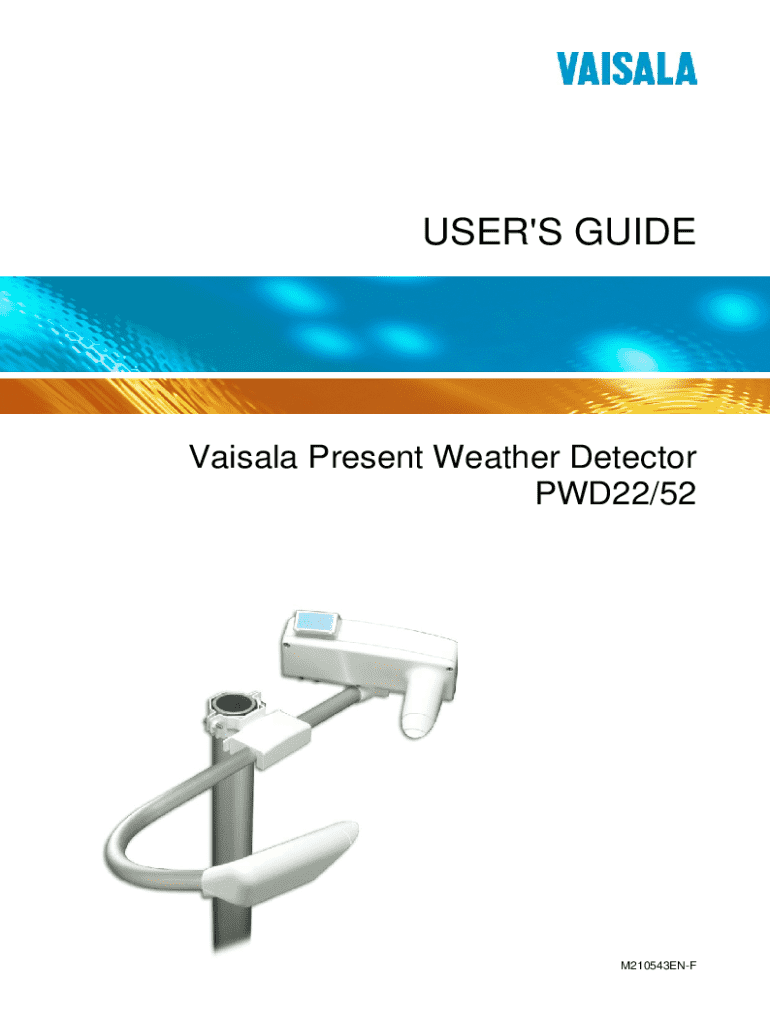 USER\'S GUIDEVaisala Present Weather Detector PWD22/52M210543ENFPUBLISHED BY Vaisala Oyj Street address: Mailing address: Phone: Fax:Vanha Nurmijrventie 21, FI01670 Vantaa, Finland P.O. Box 26, FI00421 Helsinki, Finland +358 9 8949 1 +358 9 8949 2227Visit our Internet pages at www.vaisala.com. Vaisala 2015 No part of this manual may be reproduced, published or publicly displayed in any form or by any means, electronic or mechanical (including photocopying), nor may its contents